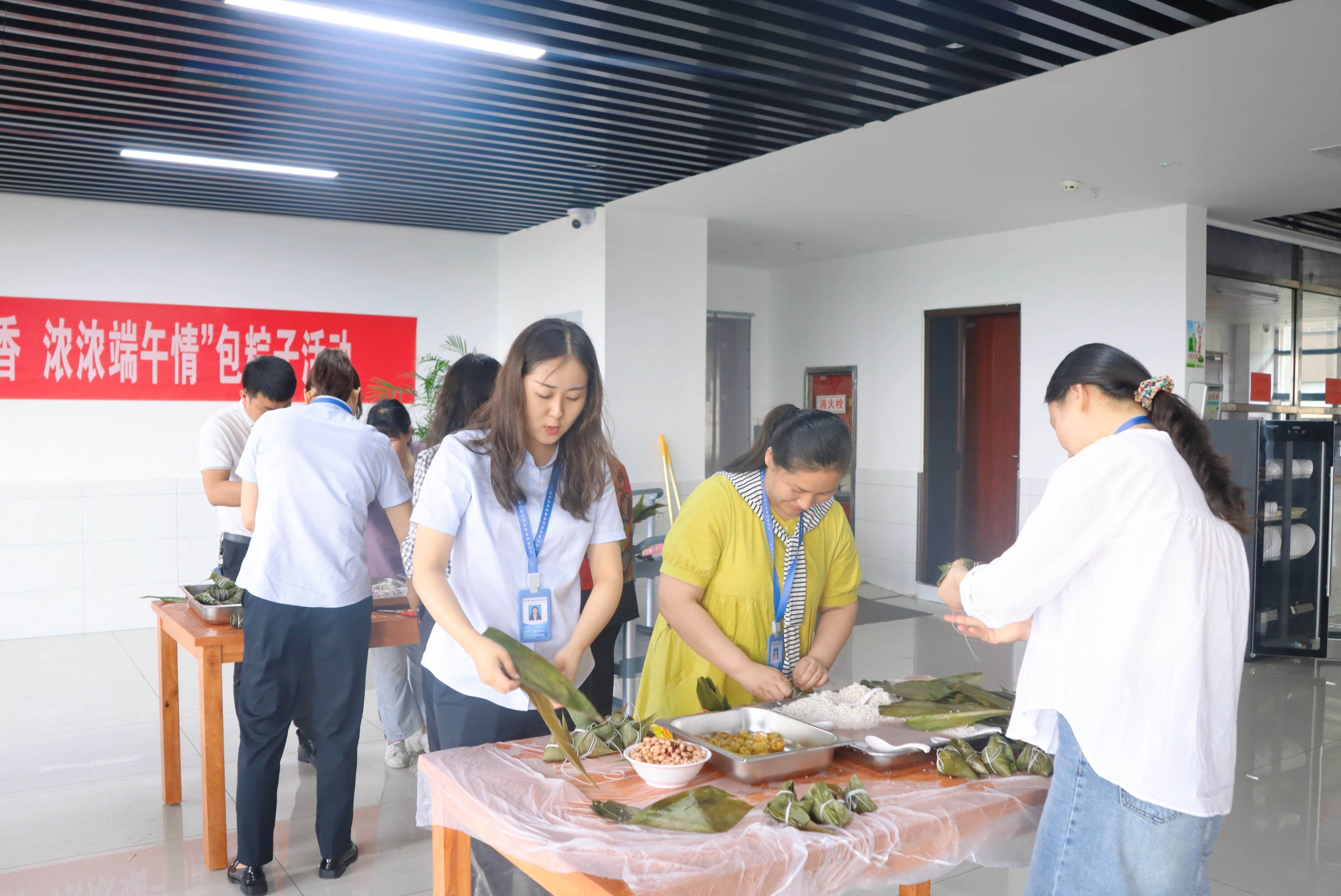四是组织开展悠悠粽子香,浓浓端午情”包粽子活动。大家在食堂拿粽叶、做漏斗、填糯米、包裹、捆绑井然有序地进行着,一片片清香的粽叶、一粒粒晶莹的糯米,转眼就变成一个个诱人的粽子,大家一起包粽子,讨论端午节的传统习俗,感受传统饮食文化的韵味和浓浓的节日氛围。